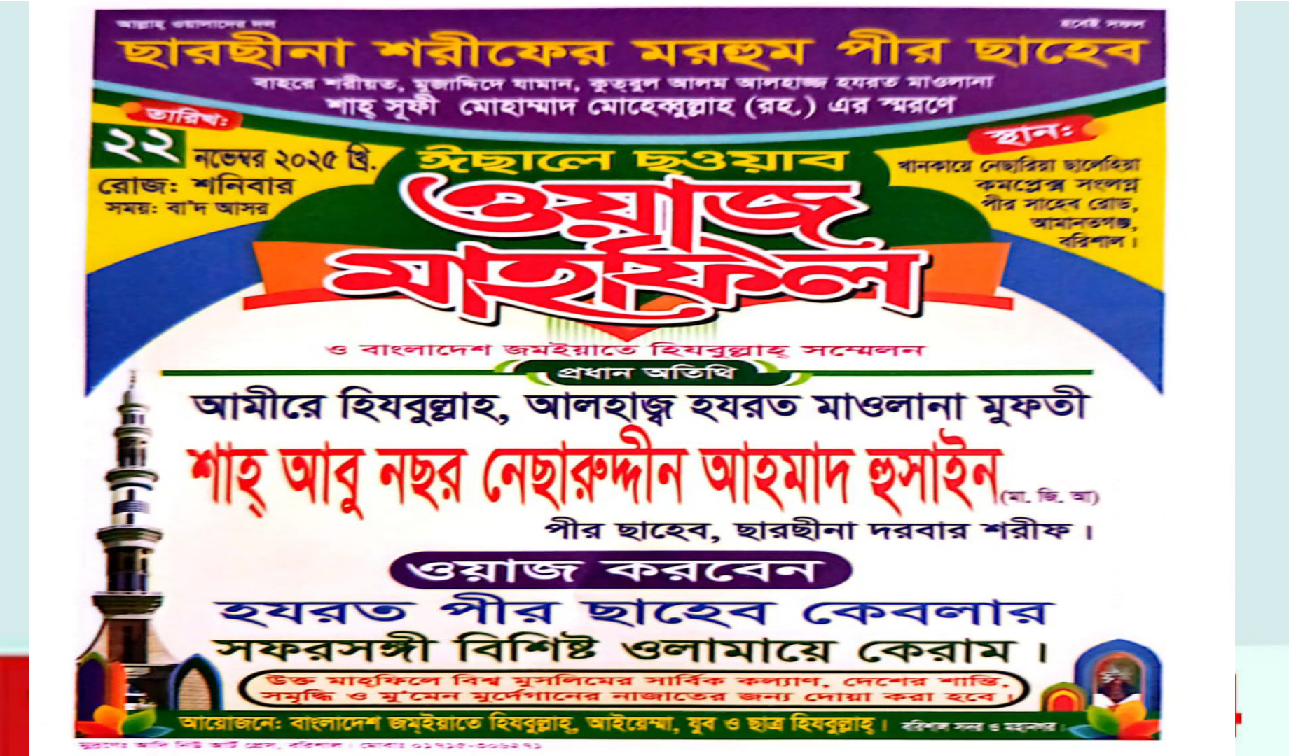 আগামীকাল শনিবার ২২শে নভেম্বর ২০২৫ বা'দ আসর ঈছালে ছওয়াব মাহফিল অনুষ্ঠিত হবে। উক্ত মাহফিল ও বাংলাদেশ জমইয়াতে হিযবুল্লাহ্ সম্মেলন
