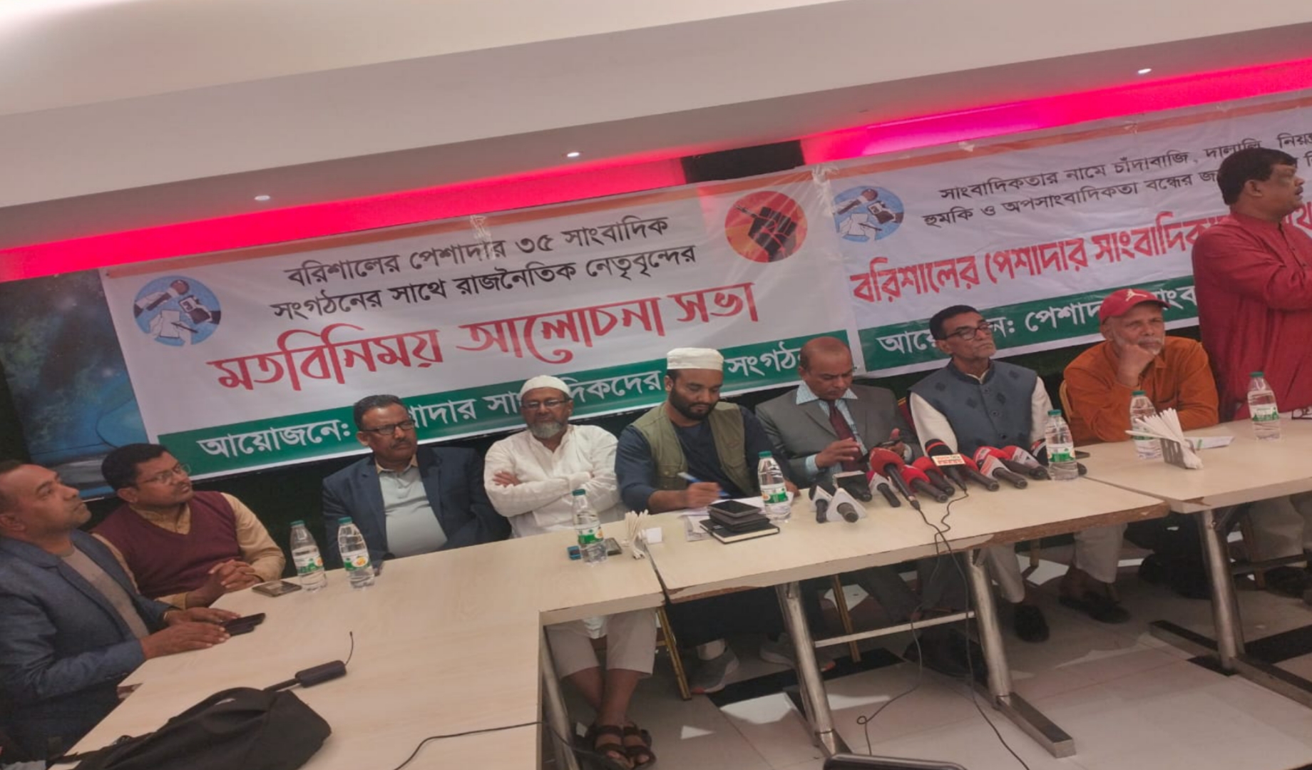 বরিশালে পেশাদার ৩৫ সাংবাদিক সংগঠনের উদ্যোগে রাজনৈতিক নেতৃবৃন্দের সঙ্গে এক মতবিনিময় আলোচনা সভা অনুষ্ঠিত হয়েছে। শনিবার সন্ধ্যায় বরিশাল নগরীর একটি অভিজাত রেস্তোরাঁয় এ মতবিনিময় সভা বসে। গণমাধ্যমের স্বাধীনতা, রাজনৈতিক পরিস্থিতি, নির্বাচনী পরিবেশ এবং গণমানুষের সমস্যাগুলো নিয়ে সাংবাদিক ও রাজনৈতিক নেতাদের মধ্যে খোলামেলা আলোচনার সুযোগ সৃষ্টি হয় এ আয়োজনে।সভায় উপস্থিত ছিলেন বিএনপির কেন্দ্রীয় কমিটির সদস্য আবু নাছের রহমাতুল্লা,বরিশাল মহানগর বিএনপির আহ্বায়ক মনিরুজ্জামান খান ফারুক, বরিশাল জেলা বিএনপির সদস্য সচিব এডভোকেট আবুল কালাম শাহীন, বরিশাল মহানগর বিএনপির যুগ্ম আহ্বায়ক আফরোজা খানম নাসরিন,