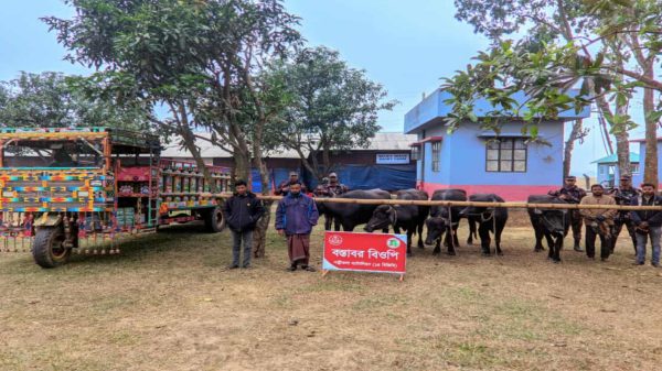 নওগাঁ সীমান্তে অভিযানে ভারতীয় মহিষ ও চার চোরাকারবারীকে আটক করা