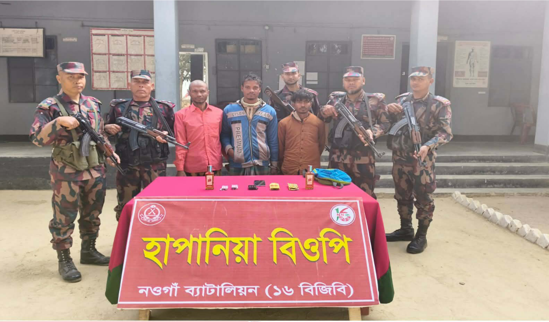 আটককৃতরা হলেন—সাপাহার উপজেলার করমুডাংগা গ্রামের মৃত মুনতাজ আলীর ছেলে মোঃ সোহেল রানা (২৪), নামো বিরামপুর গ্রামের মোঃ নজরুল ইসলামের ছেলে মোঃ মিজানুর রহমান (২৬) এবং পশ্চিম বিরামপুর গ্রামের মৃত আব্দুল হকের ছেলে মোঃ মোজাম্মেল হক (৪৫)।