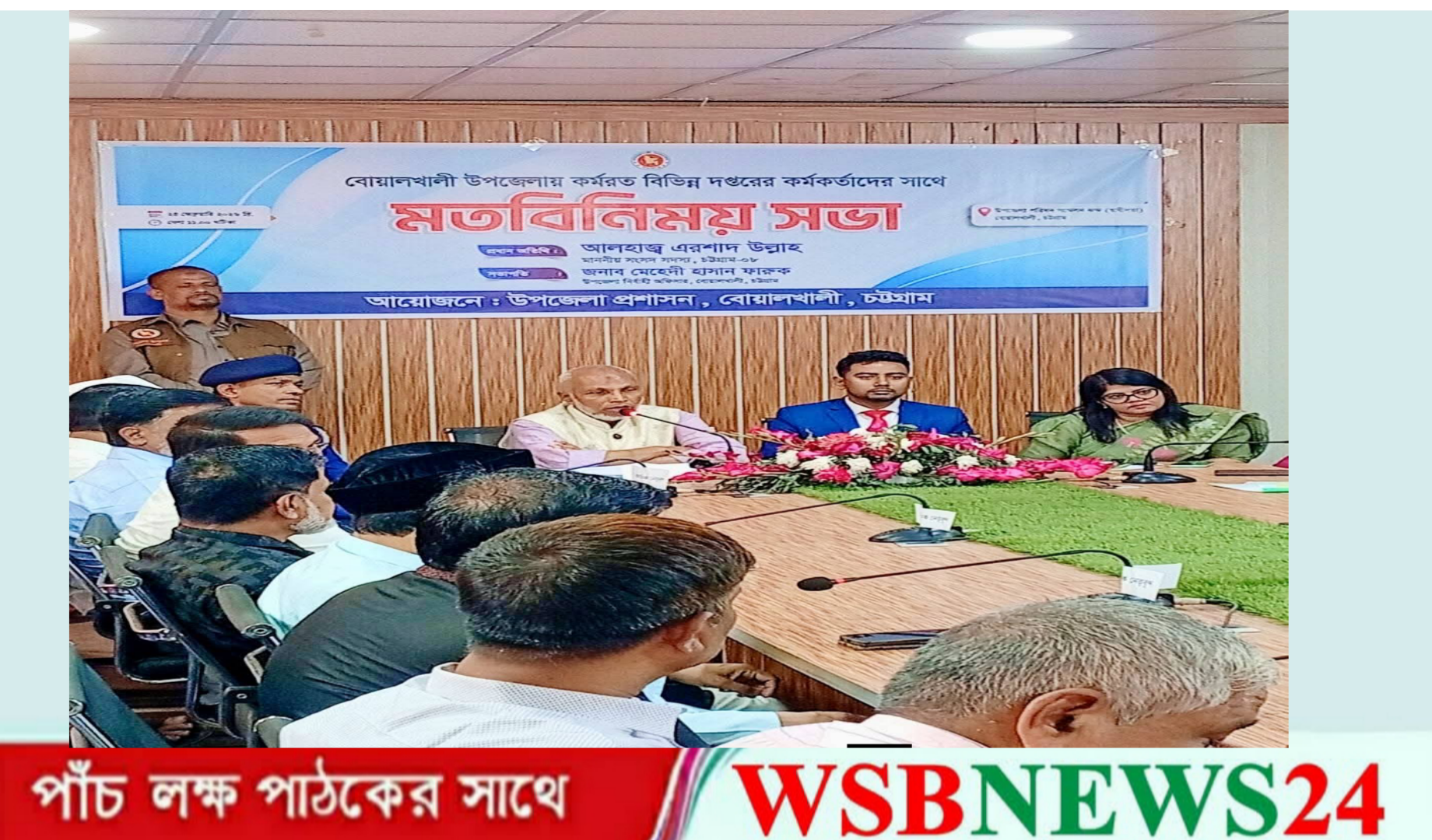 চট্টগ্রাম সাংসদীয় আসন ৮ (বোয়ালখালী চান্দগাঁও পাঁচলাইশ ও বায়োজিদ আংশিক) বোয়ালখালী উপজেলায় কর্মরত বিভিন্ন দপ্তরের কর্মকর্তাদের সাথে মতবিনিময় সভা করেছেন এরশাদ উল্লাহ। মঙ্গলবার (২৪ ফেব্রুয়ারি) উপজেলা পরিষদের হলরুমে এ সভা অনুষ্ঠিত হয়। সভায় প্রধান অতিথি হিসেবে উপস্থিত থেকে বক্তব্য রাখেন তিনি।