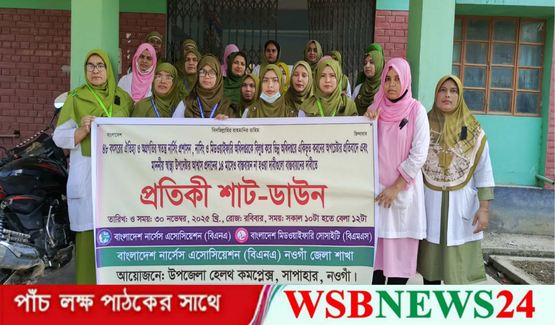 স্বতন্ত্র নার্সিং ও মিডওয়াইফারি অধিদপ্তরকে অন্য কোনো অধিদপ্তরের সঙ্গে একীভূত না করার দাবিসহ আট দফা দাবিতে নওগাঁর সাপাহারে প্রতীকি শাটডাউন কর্মসূচি পালন করেছে বাংলাদেশ নার্সেস এসোসিয়েশন (বিএনএ) ও বাংলাদেশ মিডওয়াইফারি সোসাইটি (বিএমএস)।